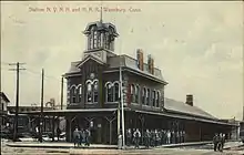 The station continued to be used for intercity rail service to the city. The New Haven's Nutmeg and several unnamed trains operated east to Hartford and Boston until 1955.[6] The company also operated trains northeast from New York City, through Waterbury, to New Britain and Hartford.[7] The Naugatuck and other NH trains went north to Winsted and south toward New York City.[8] Service declined and then stopped in the later decades of the 20th century. The last commercial service out the station was by the Penn Central railroad company.