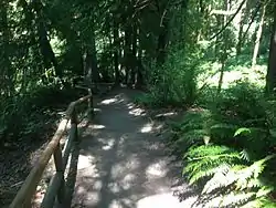 The park takes its name from the watershed of Moxlie Creek.[1] Water wells for the city of Olympia were first created in the area now comprising Watershed Park in the late 19th century. Influential Western Washington businessman Henry Clay Heermans bought the entire waterworks in 1909, and sold it to the City of Olympia in 1917.[2] After operating the wells into the 1950s, the city planned to log the area and sell the property, leading to a Washington Supreme Court battle that led to the area's preservation, with a city ordinance protecting the area presently.[3] Local environmental activist Margaret McKenny is recognized as the impetus for establishing the park as a protected place.