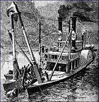 According to Dr. Hale's Early History of the Kanawha River Valley, "The first steamboat to attempt the navigation of the river (Great Kanawha) in the early days of steamboating on the western waters was the Robert Thompson in 1819. She went as far as Red House Shoals, but lacking power to stem the swift currents in that place abandoned the effort and returned." This was at the continued skeptical amusement of the local keelboat workers. Local tradition has team of horses was used to pull vessels over shoals. A team of large draft horse would later be on board some steamboats and jumped for hookup during the drought season. This unique 'horse handler', to use an old Army classification, was both blacksmith and boat mechanic, parallel the horse-drawn machine mechanic. This job position also worked along with the vessel's boiler engineer as coal tender (fuel loading), drive repair (paddlewheel system), and deck repair.[32] Henry Shreve designed the first steam-powered snagboat in 1829, The Heliopolis. Quoting the 'Tom Bevill Visitor Center', USACE Mobile District, "This double-hull design remained the standard until the early twentieth century with the development of high-strength steel hulls."