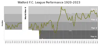 From 1921–22, the third tier of The Football League consisted of two parallel sections of 22 clubs, fighting both for promotion to the Second Division and also battling to hold on to their league status.[4] There was a re-election system in place which meant the bottom two teams in each of the two divisions had to apply for re-election to the league.[10] Watford finished outside the top six league positions in every season between 1922 and 1934. Following Kent's departure in 1926, they finished 21st out of 22 clubs in 1926–27, but were unanimously re-elected to the league after a ballot of clubs in the top two divisions of The Football League.[11] By contrast, under Neil McBain and subsequently Bill Findlay, the team recorded five consecutive top six finishes between 1934–35 and 1938–39, and won the Football League Third Division South Cup in 1937.[12] The Football League was suspended in 1939 due to the Second World War.