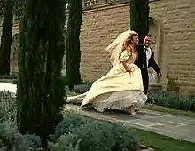 The wedding dress was a Vera Wang original dress from a while ago that I actually wore on a certain occasion and had it in storage and when we came up with the concept for the video that had the element of a wedding in it, I said, ‘well, I do have my old wedding dress,’. 'It’s still worth [sic] for me ’cause I can’t believe I was ever married but whatever, end of story. And I knew that we wouldn’t be able to get a fabulous dress like in two days so I just took that dress out of the storage – it has a 27-foot train and it was just all hand-beaded and stuff and so I figured we might as well get a use out of it.'[75]