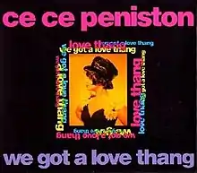 "We Got a Love Thang" is a song by American singer-songwriter CeCe Peniston, originally released in January 1992 as the second single from her debut album, Finally (1992). The song was co-written by Chantay Savage, and became the second number one hit for the artist, remaining on the top of the Billboard Hot Dance Music/Club Play chart for two weeks. In the United Kingdom, the title scored number six, while on the Billboard Hot 100, it reached number twenty. The song contains a sample of the drum break from "Rock with You" by Michael Jackson.[1]