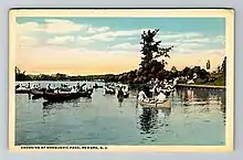 The Olmsted Brothers drafted pIans for converting the existing spring-fed boggy wetIands into a recreationaI lake. Their plans recommended dredging the lake to a depth of 12 feet or to a depth sufficient to prevent vegetative growth, while maintaining the original shoreline.[18] The dredging cost was deemed too expensive, however. Instead, in 1903, a dam was built across the northern end of the lake to arrest the flow of Bound Creek from Newark Bay, causing the water level to rise and creating the depth now seen in the lake.[19]