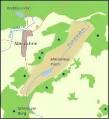 The Weißes Fenn Marzahne was formed after the last cold period, the Weichselian Glaciation. Advancing ice masses pushed a series of tunnel valley basins similar to the parallel Beetzsee-Riewendsee- or Bohnenland-Görden glacial valley, in which meltwaters flowed or collected. These ran from northeast to southwest in the direction of the advancing ice. In this series of tunnel valleys, lakes were subsequently formed, like the Pritzerber See in the southwest. Later low lines of dunes crossed the valley bottoms and they still do today in the northeast of the row of tunnel valleys.[1] These lines of dunes formed a barrier for the Weißes Fenn ("White Fen") to the southwest, so that water could no longer drain in that direction and a boggy wetland was created. In the modern period, a ditch, the Roter Graben, was cut to drain the wetland and the lake. This empties into the Pritzerber See.[2] The Weißes Fenn Marzahne with the Marzahner Fenn, an ice age glacial tongue basin which lies about 2 kilometres to the southeast.