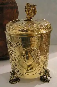 Emmerich Grach (1753–1826), the first of the actual owner-family, greeted in his function as alderman Napoleon I on 6 October 1804, when Napoleon visited Trier. He offered him wine from his vineyard St. Maximin at Oberemmel in a gold-plated silver-goblet from the 17th century. The goblet later was engraved "Gravure commandée à la memoire de ce mémorable evenement par Emmeric Grach, possesseur de cette coupe".[3] It was auctioned at Sotheby's in New York City in 2001 for $23,750USD[4] and is on permanent loan to the museum of Trier since 2004, replacing a reproduction.[5]