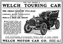 The first car, Welch Tourist, had some innovations.[1] The steering column telescoped for the driver, and an unusual two-speed transmission with all gears always in mesh was incorporated. Multiple-disc clutches within the transmission were used to select that gear that was to give the power to stop the grinding of the gears on shifting. The Welch two-cylinder vertical engine may probably be the first to use a spherical combustion chamber.