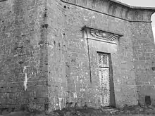 The monument is built of local stone, Calcareous Grit, a Sandstone from Northay.[6] The triangular column is 80 feet (24 m) wide at the base and 175 feet (53 m) high.[1] The base has an Egyptian winged panel above the studded iron door and is surmounted by a coved dentil cornice.[1]