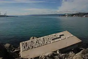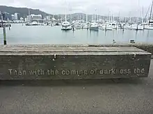 The Wellington Writers Walk is made up of a series of 23 quotations from New Zealand writers, including poets, novelists, and playwrights. The quotations are placed along the Wellington waterfront, from Kumutoto stream to Oriental Bay, in the form of contemporary concrete plaques or inlaid metal text on wooden 'benchmarks'.[1][2][3][4] They were designed by Catherine Griffiths and Fiona Christeller and installed to honour and celebrate the lives and works of these well-known writers, all of whom had (or have) some connection to Wellington.