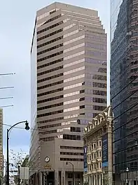 The Wells Fargo Tower, formerly known as the First Union Signet Tower, Wachovia Tower, and Union Trust Building,[3] is a commercial high-rise in Baltimore, Maryland. The building rises 24 floors above street level and is 330 feet (101 m) in height;[1] it is tied with Charles Center South as the 17th-tallest building in the city. The structure was completed in 1985.[2] The Wells Fargo Tower was developed by the Dallas-based Trammell Crow Company, and is currently owned by the Wells Fargo and Company.[1] The structure is an example of modern architecture, and has a glass, steel and concrete façade.[2] The Wachovia Tower rises from the site formerly occupied by the Calvert Building and 7-9 Saint Paul Street.[1] The building, formerly housing offices for Wachovia, is now home to the regional office of Wells Fargo and Company.