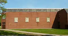Construction of the fourth (and current) Wells High School began in 1976 and was completed in 1977. The building is located at 200 Sanford Road (ME-109) and was built at a cost of $2.9 million. It was designed by Wilbur R. Ingalls, Jr. The 1937 building became a junior high school that same year.[3] The 1977 building originally had only two stories, but Ingalls designed it so that a third story could be added later if the student population increased. A partial third story was constructed in the late 1980s in order to provide additional classrooms. One of the building's unique design features is that it resembles the letter "W" when viewed from above. The gymnasium was named in honor of Richard Ronco, a 1960 graduate of Wells High School and a member of the Wells School Committee.[8] In 1999, the auditorium underwent interior renovations and was named in honor of Valjeane Olenn, who served as principal of Wells High School from 1986 to 1998.[9] Olenn's tenure as principal was noteworthy for several reasons: she was the first female principal in Wells; she was one of the longest-serving principals of the high school; and she instituted block scheduling, which was new and innovative at the time.