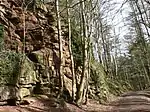Red rocks are a visible and striking feature of the park, with much of Ewloe Castle built from it. The rocks have a distinctive red colour, because of the iron content of the sandstone in this region. Much of the iron in the original sands and gravels has rusted in the warm and wet tropical conditions of prehistoric Wales. Red rocks also often indicate the presence of coal and Wepre Park has many small surface pits, dug by hand before the heavy machinery of the Industrial Revolution was invented.