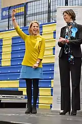 For the 2017 general election, Hobhouse was selected to stand for parliament in Bath.[19] The constituency was held by the Conservative MP Ben Howlett, and had previously been held by the Liberal Democrat Don Foster from 1992 to 2015. Hobhouse stood on a pro-European platform which emphasised housing, education, congestion and pollution concerns, as well as opposition to the incumbent Conservative MP's plans to link the A46 and A36 roads together. Her party emphasised the need for Labour supporters to vote tactically for Hobhouse to defeat the Conservatives.[5][20] Hobhouse gained the seat with a majority of 5,694 votes and a 17.6% increase in the Liberal Democrat vote share, the second-highest vote share increase for the party nationally.[21][22]