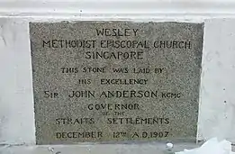 In early 1907, Sir John Anderson, the Governor of the Straits Settlements, granted a 38,000 square foot plot of land at Fort Canning for a church to be erected on a hill, "on the Tanglin side of the Museum". In 1907, the church at Coleman Street was sold to the Anglo-Chinese School (becoming its hall[2]) and money was raised to build a new church. Anderson personally laid the cornerstone with an inscribed silver trowel on 12 December 1907. After completion, the first worship at the new compound was held on 25 December 1908, and formal dedications were done on 4 February 1909 by Bishop William Oldham. It was only on 7 January 1910 that the church was renamed the Wesley Methodist Church after the founder of Methodism, John Wesley.[1][3]