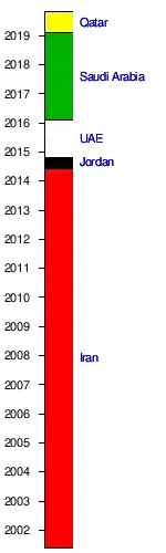 The founding members of the West Asian Football Federation are Iran, Iraq, Jordan, Lebanon, Palestine and Syria. In 2009, three more associations joined the federation: Qatar, United Arab Emirates and Yemen. Four other nations of West Asia: Bahrain, Kuwait, Oman and Saudi Arabia joined in 2010.[2] Iran left the federation on 10 June 2014, with the creation of the Central Asian Football Federation.