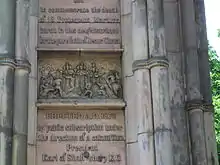 It was not only the vicars that were in trouble:a parishioner who in 1520 abused the rector in the pulpit, calling him a false, forsworn man, may have held Protestant views.[49] In 1556 a member of the parish, Agnes George, part of the Stratford Martyrs, was out of favour with Queen Mary, for refusing to attend church until the service was no longer conducted in the Roman Catholic tradition.[50] She was then tried before the Bishop of London, Reverend Edmund Bonner, along with 12 others.[51] During her time at Newgate Prison she wrote a letter attacking the Pope for being the Anti-Christ, saying that she was baptised in Christ's Church not Rome and refusing to believe that bread and wine became the body and blood of Christ. She was burned at Stratford[52] before 20,000 people. In 1879, a large monument was erected in St John's churchyard in Stratford Broadway, to commemorate the thirteen and others who were executed or tortured in Stratford during the persecutions.