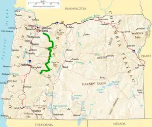 The route is roughly northโ€“south, from Estacada southeast of Portland to Oakridge on the Willamette River southeast of Eugene. Much of the route is very sparsely populated, passing through timber regions in the Cascades.