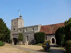 West Drayton's parish church, dedicated to Martin of Tours, was first mentioned in the 12th century.[21] However, no trace of the original church remains. The present church was first built in the 13th century, of which the base of the tower, the piscina and the north chancel wall are incorporated in the present building, which dates from the 15th century. The church was heavily restored and reordered in 1974, when the altar was resited at the west end. The baptismal font is a splendid example of mid-15th century work, and the parish chest is early 17th century. There are monumental brasses to Richard Roose (1406), Margaret Burnell (1529), her son John Burnell (1551) and Dr James Good (1581, a physician to Mary, Queen of Scots). There is a small memorial tablet to George Carey, 2nd Baron Hunsdon (1547-1603) who was Lord of West Drayton Manor between 1592 and 1603.[22] Carey's father was Queen Elizabeth I's cousin. The memorial states how 'bountiful' he was to the poor of the Parish. In his will Hunsdon left the sum of 'one hundred marks for the benefit of the poor of West Drayton for ever.' This is one of the oldest West Drayton Parish charities and its small income is still distributed each New Year's Day.[12]