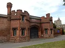 While he was leasing the manor William Paget used the existing building of St Pauls which was situated near St Martin's Parish church. Paget described the building as his "cotage at Drayton".[12] Once owning the manor he built a new manor house, completed by 1549, which occupied the western end of the churchyard. The Manor grounds contained the Church, ornamental gardens, stables, a dovecote and other outbuildings and was enclosed by a high brick wall and two gatehouses.[13] The wall and one of the gatehouses can still be seen today. The construction of the manor house and grounds resulted in the demolition of villagers' homes on Church Road and building on the graves of generations of West Drayton people in the churchyard. In addition to this, Paget enclosed 150 acres of common land to add to his demesne. In 1550 Paget legalised his position by obtaining a royal pardon for his actions.[12] The loss of the Parish churchyard was compensated for by the granting of an alternative burial site which was situated on the eastern side of where Drayton Hall is today. The burial site was used until 1888.[12]