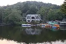 The Hanbi Pavilion (涵碧楼) was built in 1922. It is a small two floor Western-style building. During the Nanchang Uprising, it was used as the office for Zhou Enlai.[3] Other attractions include Rainbow-shaped Bridge (虹桥), Mid-Lake Pavilion (湖心亭), Jinghan Pavilion (景韩亭; named after Han Yu), Xinsu Pavilion (新苏亭; named after Su Shi), Wenshan Pavilion (文山亭; named after Wen Tianxiang), Fishing Platform (钓鱼台), and Wild Goose Pagoda (雁塔).[4]