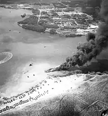 At 15:08, LST-353, moored at Tare 8, exploded, sending a large fireball into the sky.[1][2] The noise was heard miles away at Pearl Harbor Headquarters. Una and Sandy Walker were with Admiral Chester W. Nimitz at his quarters when they heard the explosions. Because of the "L.S.T. tragedy", wrote Una, they cancelled a planned post-dinner cruise around Pearl Harbor aboard Nimitz's dark blue admiral's barge. Instead, they "rested with [a] private dinner with Adm. & Doc & Hal" at Makalapa. While they dined, the LSTs continued to explode and burn to the waterline. Nimitz was given updates on efforts to contain the disaster across the harbor.[3] More explosions of increasing intensity followed, sparking fears of a Japanese attack or even an earthquake. Fire and debris raining down on the fuel and munitions stored on the decks of other LSTs had caused an explosive chain reaction.[1][4] Within minutes, 200 men had been blown into the water. Eleven wooden buildings on the shore were destroyed and vehicles blown on their side.[1] In all, 20 buildings were damaged.[2]