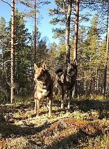 The West Siberian Laika or WSL, is a breed of spitz–type hunting dog. Russian publications indicate that the term West Siberian Laika loosely applied to hunting dogs originating with the Mansi and Khanty people in Ural and West Siberia, but there were no standards or registrations of WSL as such until 1930. Then WWII disrupted it for a while, but systematic breeding with registrations resumed after the war ended, in 1946. This was the time the breed began taking modern shape. Before that hunters only knew of Mansi Laika and Khanty Laika. In early 1960 many hunters in Ural still preferred the term Mansi Laika, when speaking of West Siberian Laika.[1] In Russian language, the term Laika originated from the word layat that means to bark. The word Laika simply means barker. Any hunting Laika is a bark pointer (pointing at animal of interest by barking and staying with the animal[2] ). It is a versatile dog depending on use and environment, but in certain parts of the country they have become more specialized.[3]