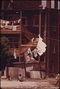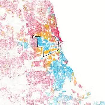 The Chicago West Side has gone through many transitions in its ethnic and socioeconomic makeup due to its historic role as a gateway for immigrants and migrants as well as its role for funneling poorer African-American residents away from the wealthier lakeside neighborhoods and central business district.[2] Today, the West Side consists of large mixed communities of middle class, working class, and low-income African American, Puerto Rican, and Mexican residents; some small communities of blue-collar, lower middle class and middle class white residents of historically Polish, Italian, Czech, Russian Jewish, and Greek, descent; and newer communities of middle-class, upper-middle class, and wealthy white residents created by gentrification.[3] Major shifts continue to happen due to forces such as rapid gentrification, selective corporate investments, and unequal distribution of city resources.[4][5]