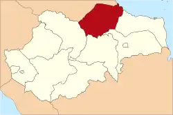 The regency is divided into thirteen districts (kecamatan), tabulated below with their areas and their populations at the 2010 census[2] and the 2020 census,[3] together with the official estimates as at mid 2022.[1] The table also includes the locations of the district administrative centres, and the number of villages in each district (totaling 114 rural desa and 20 urban kelurahan - the latter comprising 8 in Tungkal Ilir District, and one in each of the other 12 districts), and its post code.