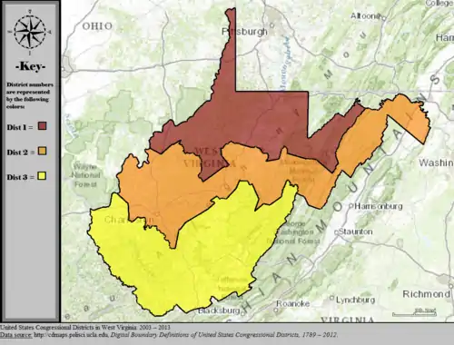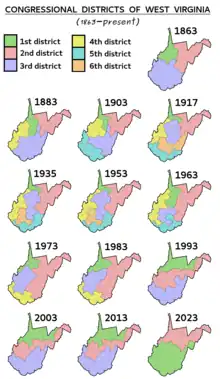 Table of United States congressional district boundary maps in the State of West Virginia, presented chronologically.[3] All redistricting events that took place in West Virginia between 1973 and 2013 are shown.