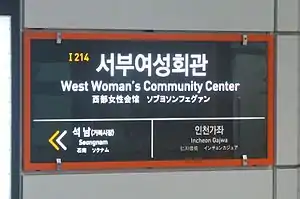 West Woman's Community Center Station is a subway station on Line 2 of the Incheon Subway, Republic of Korea.