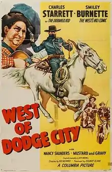 West of Dodge City is a 1947 American Western film directed by Ray Nazarro and written by Bert Horswell. The film stars Charles Starrett, Nancy Saunders, Mustard, Gravy and Smiley Burnette. The film was released on March 27, 1947, by Columbia Pictures.[1][2][3]