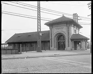 The station was built in 1908 as part of the New York, New Haven and Hartford Railroad, which expanded its Harlem River Branch line into an electrified main line into New York. The railroad planned twelve new stations along the route to serve local commuters, and commissioned the architect Cass Gilbert to design them. Gilbert, who was already renowned for having designed the U.S. Custom House in Lower Manhattan, produced plans for each of these in a number of different styles, though not all were actually built. For the station at Westchester Avenue, Gilbert chose a richly ornamented exterior with glazed terra cotta details and signage with gold colored metallic lettering. Gilbert would later incorporate glazed terra cotta details into his design for the Woolworth Building, which was completed in 1913.[3]