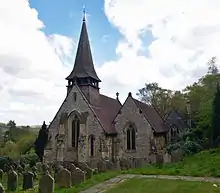 Many pre-1800 listed buildings, including some that are thatched, are in the lanes leading off the A25, including Leslie Howard's (actor 1893–1943) Stowe Maries, built in the 1550s, in Balchins Lane. Milton Street and Westcott Street lead to several more old buildings.[10] The Church of the Holy Trinity is Grade II listed because it was designed in 1851, by Sir George Gilbert Scott, and is made of knapped flint with ashlar quoins/dressings. Its spire has a clock, striking bell and weather vane, and there is a small western turret.[11] Charles Barclay of Bury Hill gave equivalent to £116,485 in 2021 for it to be built, and Lady Mary Leslie the same, as an endowment. The clock was installed to commemorate the Jubilee of 1887. The parsonage was built at the expense of Barclay and the secular Westcott School was built by subscription in 1854. The infant school was also built by subscription, in 1882.[9]