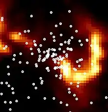 View of the core of the molecular cloud as seen by Herschel/SPIRE at 500 µm. Overlaid (white circles) are young stars detected by the Chandra X-ray Observatory.[26][27]