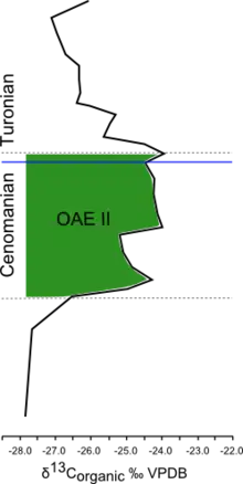 Western Interior Seaway strata preserve the positive13Corganic excursion during Oceanic Anoxic Event II, meaning there was excellent preservation of organic carbon. However, other evidence is conflicting. Molybdenum, an oxygen-sensitive trace metal, will be present in unoxidized form in strata only if there is anoxia. One study showed lack of molybdenum in Oceanic Anoxic Event II strata.[8] Other studies demonstrated the persistence of benthic organisms that could not live in anoxic settings throughout the entirety of Oceanic Anoxic Event II.[7] Consequently, there is a difference in opinion of the relationship between benthic oxygen conditions and what a positive shift of the 13Corganic curve represents. Anoxia in the Western Interior Seaway during Oceanic Anoxic Event II is still an enigma.