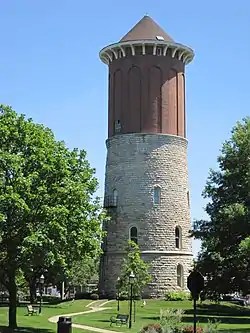 The Western Springs Water Tower is a museum and former water tower in Western Springs, Illinois. The stone tower is 112.5 feet (34.3 m) tall and 36.5 feet (11.1 m) in diameter. Construction on the tower began in 1892 and finished in 1893. Civil engineers Benezette Williams, Edgar Williams, and Ethan Philbrick designed the tower. In addition to holding water, the tower originally held the Western Springs police department, jail, and municipal offices. The village services all left the tower in 1968, and the Western Springs Historical Society opened a village museum in the tower two years later.[2] In 1991, a lightning strike set the tower on fire, destroying the water tank; the museum reopened in 1993 after extensive rehabilitation efforts. The water tower is considered a symbol of Western Springs by residents, and multiple businesses and local organizations have taken their names from the tower.[3]