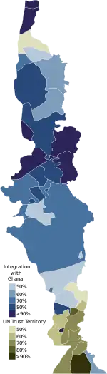 On 9 May 1956, this plebiscite was held under UN supervision and gave two alternatives to the people: union with soon-to-be Ghana or continuation as a Trust Territory until neighbouring French Togoland had decided upon its future. A third option, independence, was not listed. The Ewe-based Togoland Congress campaigned against integration with Ghana and preferred amalgamation with French Togoland, with the aim of forming a single, Ewe-majority country. The eventual result was reported to be 58% in favour of integration, although in the southern part of the territory, where the Togoland Congress had campaigned vigorously, 55% of voters had voted for separation from Gold Coast and continued UN Trusteeship.[6]
