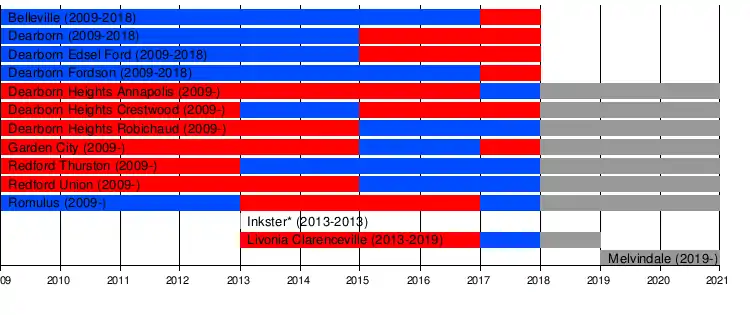*Inkster joined the WWAC during the 2012–13 school year and played spring sports. However, before Inkster could start their first full season in the WWAC, their school district closed. This resulted in the high school closing which gave Inkster no choice but to withdraw from the conference.