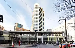 Westlake Center is a four-story shopping center and 25-story office tower in downtown Seattle, Washington, United States. The southern terminus of the Seattle Center Monorail, it is located across Pine Street from Westlake Park, between 4th and 5th Avenues. It is named for Westlake Avenue, which now terminates north of the mall but once ran two blocks farther south to Pike Street. Westlake Park is considered Seattle's "town square"[3] and celebrities and political figures often make appearances or give speeches from the building's balcony.[4][5] The anchor stores are Saks Off 5th and Nordstrom Rack.