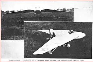 Three-seat cabin monoplane of 44 ft 4 in (13.51 m) span and 19 ft 6 in (5.94 m) length, produced in 1931. Pitch and roll control by elevons. Also a braced monoplane, the wings had variable sweep through a small range of angles, to allow longitudinal trim in flight in the absence of any horizontal stabiliser. Air Ministry Specification 16/29 was issued to Westlands for an "Experimental Tailless Aircraft" with a contract to design and build one aircraft.[6] The aircraft was given serial K1947 and first flew in March 1931 with a 120hp de Havilland Gipsy III engine in a pusher configuration.[6]
