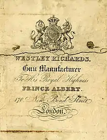 Westley Richards is a British manufacturer of guns and rifles and also a well established gunsmith. The company was founded in 1812 by William Westley Richards, who was responsible for the early innovation of many rifles used in wars featuring the British Army during the 1800s. It remained in the hands of the Richards family until it was purchased by Walter Clode in 1957. Currently the company has two listed directors, Alexander Clode and Sheikh Sultan Bin Jassim Al Thani of Qatar.[1][2] The company has received a number of royal warrants since 1840.