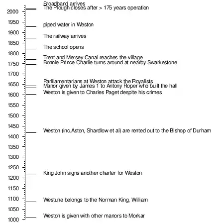 | – Note: Berewicks (outlying estates) of this manor, at that time, included Aston-on-Trent and Shardlow. Earlier evidence dated 1009 place Weston on Trent at the head of an estate which went as far as the Derwent and included not only Shardlow and Aston but also Wilne.[7] |