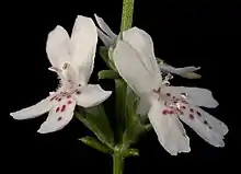 The bracteoles are 1 to 1.5 mm long. The outer surface of the green calyx is densely hairy. The corolla is 6 to 7 mm long, and is white, frequently with a mauve tinge, and orange to orange-brown dots.[7]