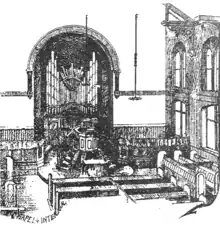 A drawing exists of the interior of the church as arranged in 1882.[5] The organ is in an apse at the north end. The pulpit, which has access by stairs on both sides, is in a central position in front of the organ. The communion table stands in front of the pulpit. Rows of pews face the table from right, left and centre.