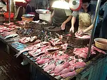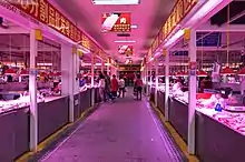 As of 2018, wet markets remain the most prevalent food outlet in urban regions of China despite the rise of supermarket chains since the 1990s.[4] In 2016, a Meat & Livestock Australia study of imported meat consumers in 15 Chinese cities found that 39% of those consumers had purchased beef from a wet market in the preceding month, while the same proportion who had purchased beef from a supermarket in the preceding month.[5] However, wet markets have been losing ground in popularity compared to supermarkets, despite the fact they may be seen as healthier and more sustainable.[6] Reports suggest "although there are well-managed, hygienic wet markets in and near bigger cities [in China], hygiene can be spotty, especially in smaller communities."[7] During the 2010s, "smart markets" equipped with e-payment terminals emerged as traditional wet markets faced increasing competition from discount stores.[3] Wet markets also began facing competition from online grocery stores, such as Alibaba's Hema stores.[8]