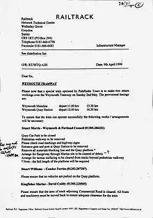 In January 2009 it was reported that Weymouth and Portland Borough Council wished to remove the tramway, and that Network Rail had confirmed it had no wish for its retention.[3] In February 2009, the council agreed to purchase the line from Network Rail for £50,000, prior to a final decision on its future.[4] However, it was reported in July 2014 that the sale of the line never went through and a campaign started to reopen the tram route claiming it would help with tourism and reduce car usage in the town. In August 2015 a report appeared in the Dorset Echo saying that a petition online had been set up to reopen the line.[5] In February 2016 the council bid for the tramway to be put into a permanent out-of-use status, however Network Rail never made this change.[6]