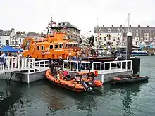 The Royal National Institution for Preserving Life from Shipwreck (as the RNLI was then known) provided a lifeboat at Portland in 1826 but it was withdrawn in 1851.[1] The Earl of Strafford asked for a lifeboat to be stationed at Weymouth in 1868 and his request was granted when a new RNLI station opened on 26 January the following year. A boathouse was built along with a slipway into harbour.[2] The boathouse was rebuilt in 1921 to allow it to receive a motor lifeboat, although this was not on station until 1924. In 1930 a new Barnett class lifeboat was stationed at Weymouth. This was too large to fit into the boathouse, so was kept at moorings in the harbour, an arrangement that continues to this day.[3] In 2003 access to the boat was made easier by the construction of a floating pontoon.[3]