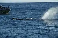 Many places that were formerly whaling stations went into recession after the collapse of the whaling industry; New Zealand stopped whaling in 1964.[3] Whaling did not stop due to environmental or ethical concerns but because the declining number of whales made the industry uneconomic. Whilst New Zealand protected right whales in 1935, it was not until 1978 that all marine mammals were protected by law.[4] Kaikōura's recent development has been used to advocate the benefits of whale watching over whale hunting and other whale-watching operators such as Auckland Whale & Dolphin Safari have successfully combined scientific research and conservation efforts alongside their commercial offering. Due to illegal whaling by Soviet Union (with help of Japan) in the 1970s, recovery state of baleen whales migrating to New Zealand coasts were heavily slowed down, far worse than in Australian waters, and this contributed to make public images that Kaikōura is the only site for whale watching, and Sperm Whale is the only species can be observed normally. New Zealand is the first nation in the world to protect marine mammals by law.
