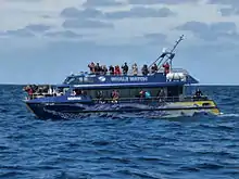 The dominant organisation in Kaikōura's whale watching industry is Whale Watch Kaikōura, which is run as a charitable organisation. It takes around 100,000 visitors out by boat per annum, and has an annual turnover of NZ$10m.[5] Whale Watch Kaikōura began operating in 1987 with a 6 metres (20 ft) boat.[4] Whale watching is also done by air, and the Kaikoura Aerodrome is mainly used for whale spotting tourist flights by Wings over Whales and Air Kaikoura – Kaikoura Aero Club.