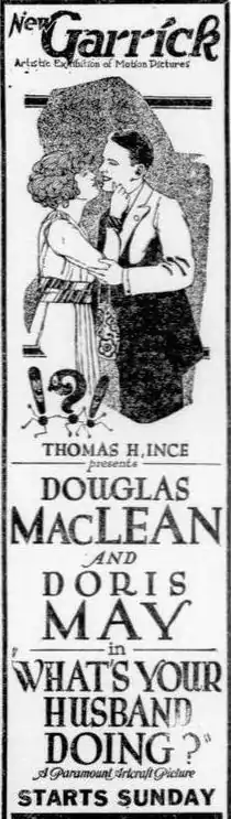 What's Your Husband Doing? is a 1920 American silent comedy film directed by Lloyd Ingraham and written by R. Cecil Smith based upon the play of the same name by George V. Hobart. The film stars Douglas MacLean, Doris May, Walter Hiers, William Buckley, Norris Johnson, and Alice Claire Elliott. The film was released on January 25, 1920, by Paramount Pictures.[1][2]