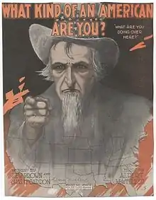 "What Kind of an American Are You?", also known as "What Kind of American Are You?", is a World War I era song released in 1917. Albert Von Tilzer composed the music. Lew Brown and Charles R. McCarron wrote the lyrics.[1] The song was published by Broadway Music Co. of New York, New York. On the cover is a gray drawing of Uncle Sam pointing. A map of the United States is featured on the lower half of the cover.[2] The song was written for voice and piano.[3]